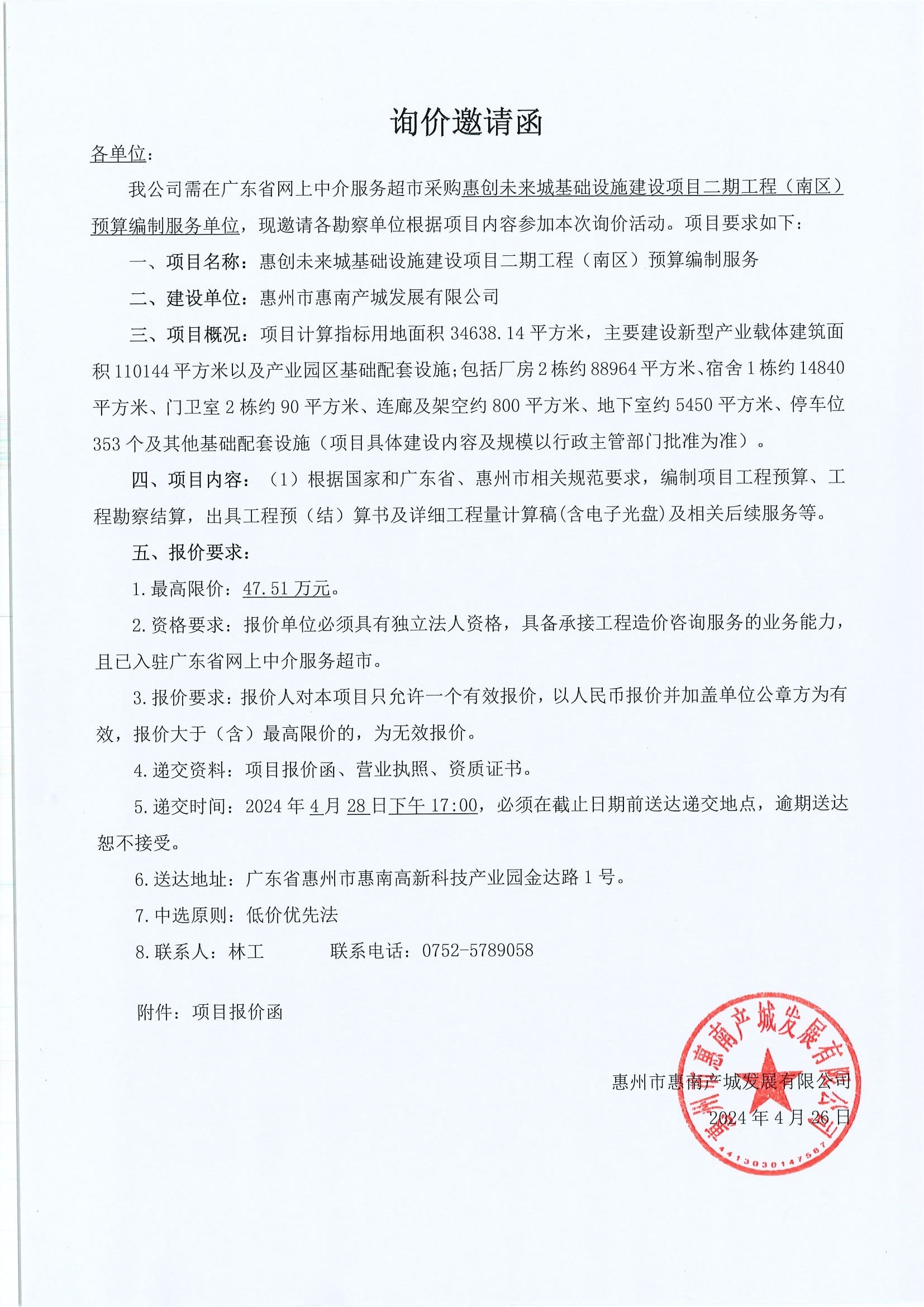惠創(chuàng)未來城基礎(chǔ)設(shè)施建設(shè)項(xiàng)目二期工程(南區(qū))預(yù)算編制服務(wù)詢價(jià)邀請(qǐng)函