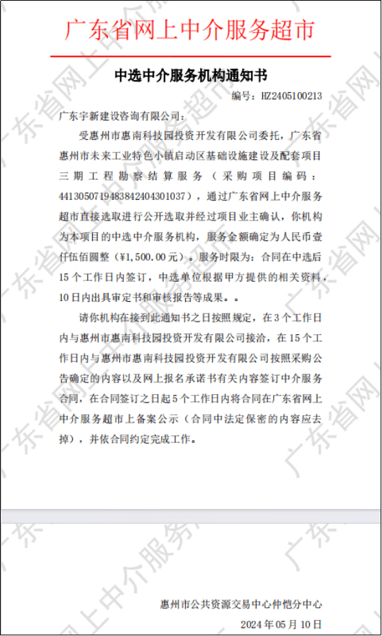 【中選公示】廣東省惠州市未來工業(yè)特色小鎮(zhèn)啟動區(qū)基礎(chǔ)設(shè)施建設(shè)及配套項目三期工程勘察結(jié)算服務(wù)