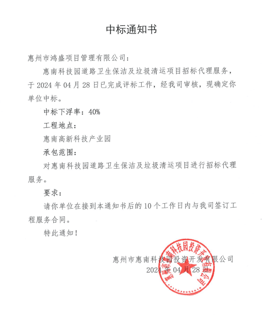 【中標通知】惠南科技園道路衛(wèi)生保潔及垃圾清運項目招標代理服務(wù)