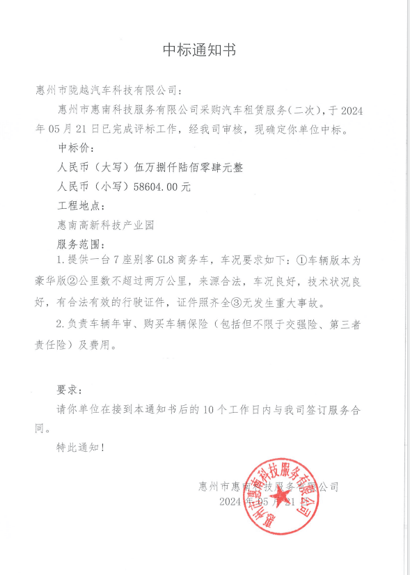 【中標通知】惠州市惠南科技服務(wù)有限公司采購汽車租賃服務(wù)(二次)