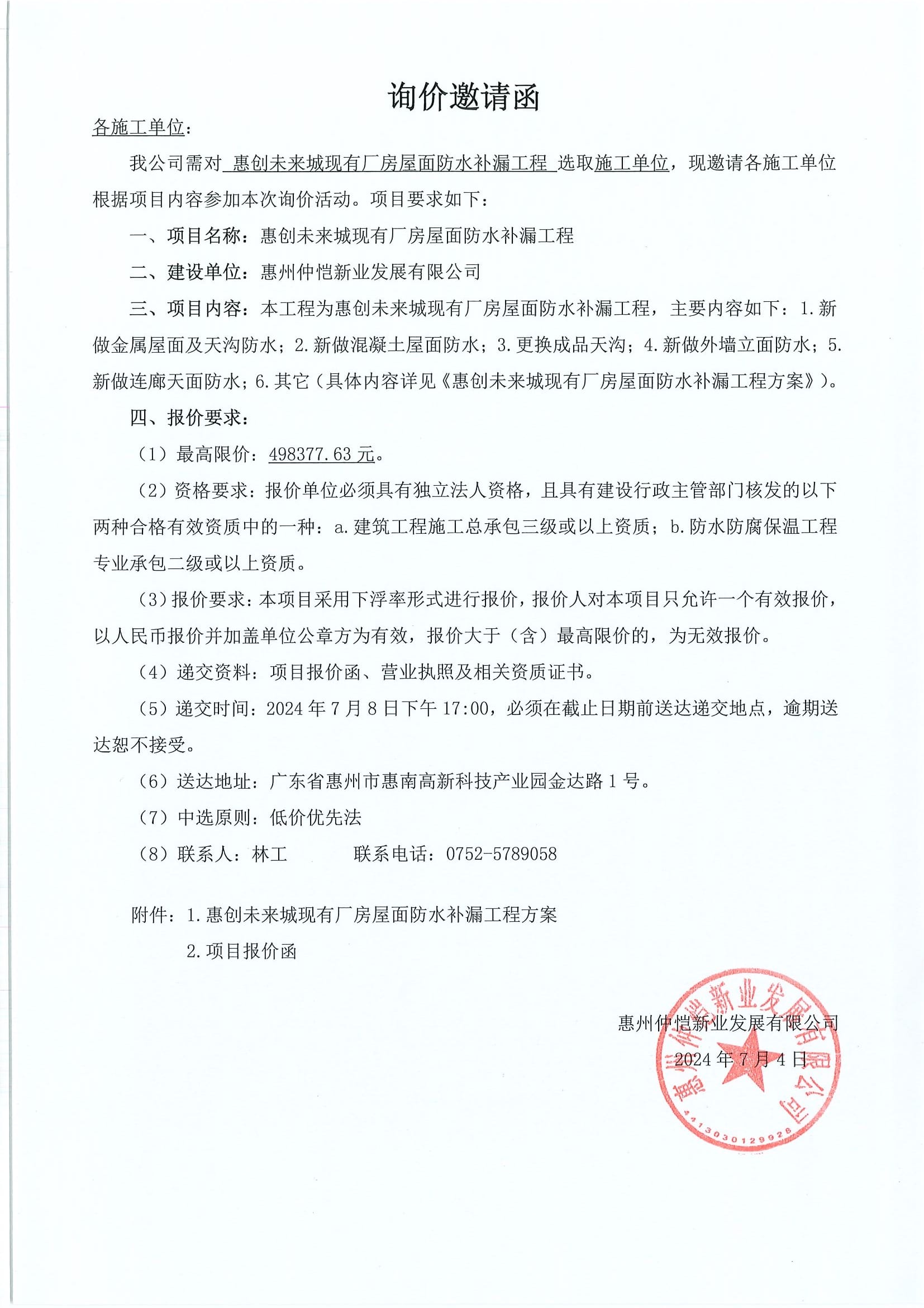 惠創(chuàng)未來城現(xiàn)有廠房屋面防水補漏工程詢價邀請函