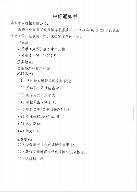 【中標(biāo)通知】采購(gòu)一臺(tái)履帶式遙控除草機(jī)服務(wù)