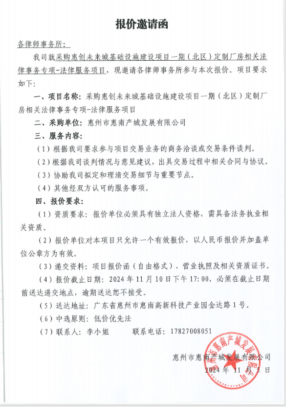 采購(gòu)惠創(chuàng)未來(lái)城基礎(chǔ)設(shè)施建設(shè)項(xiàng)目一期(北區(qū))定制廠房相關(guān)法律事務(wù)專(zhuān)項(xiàng)-法律服務(wù)項(xiàng)目