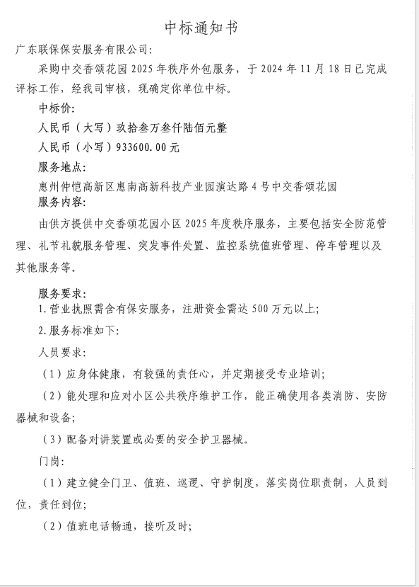 【中標(biāo)通知】采購(gòu)中交香頌花園2025年秩序外包服務(wù)