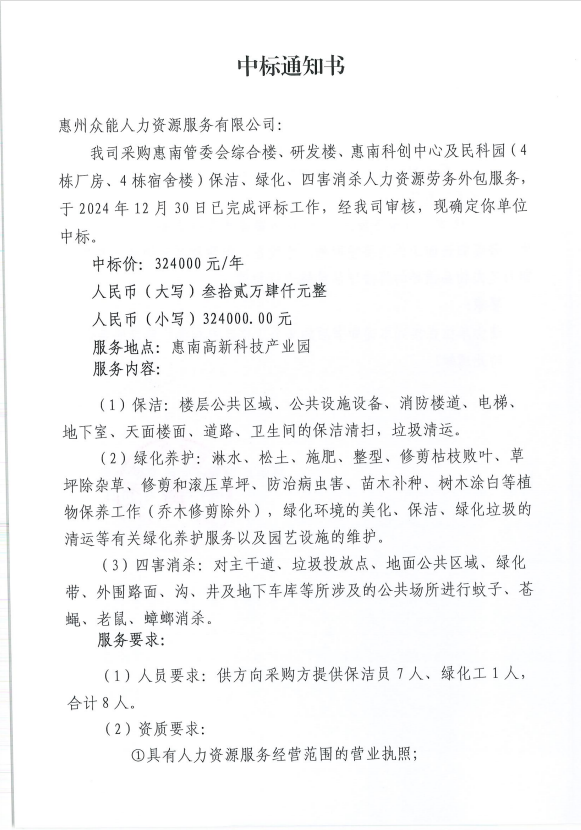 【中標(biāo)通知】采購惠南管委會綜合樓、研發(fā)樓、惠南科創(chuàng)中心及民科園(4 棟廠房、4棟宿舍樓)保潔、綠化、四害消殺人力資源勞務(wù)外包服務(wù)