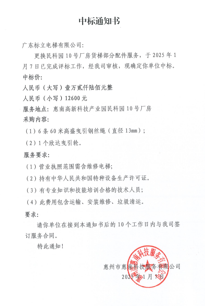 【中標(biāo)通知】更換民科園10號廠房貨梯部分配件服務(wù)