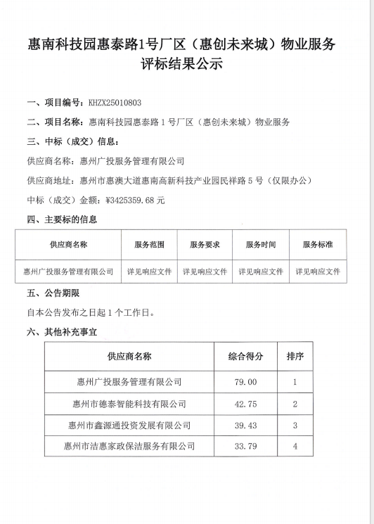 惠南科技園惠泰路1號(hào)廠區(qū)(惠創(chuàng)未來(lái)城)物業(yè)服務(wù)評(píng)標(biāo)結(jié)果公示