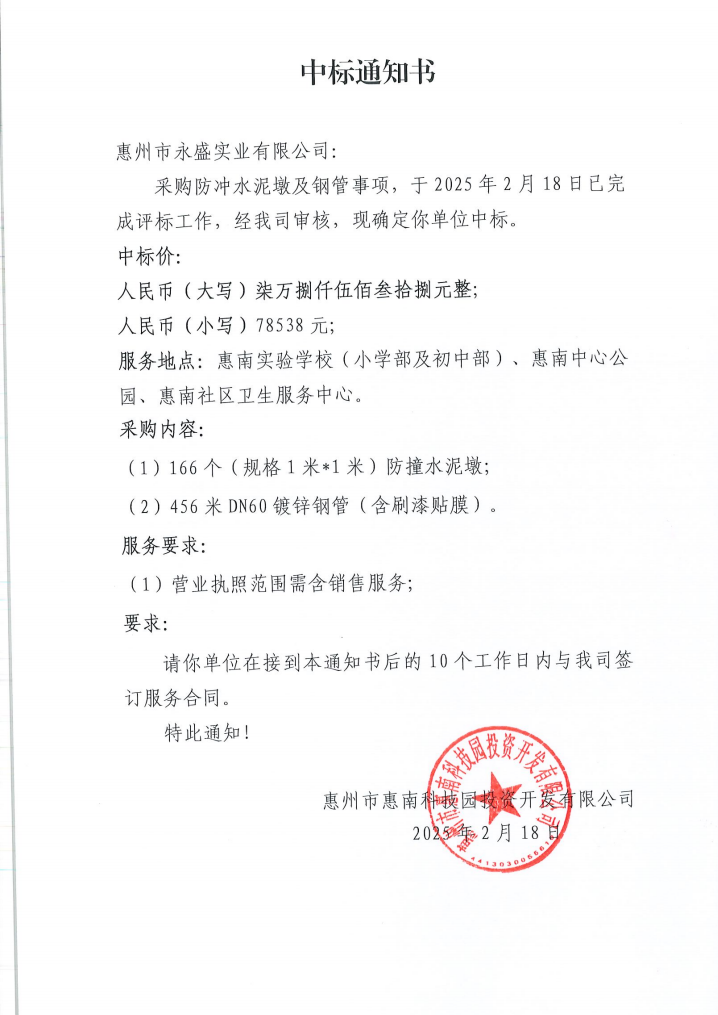 【中標通知】采購防沖水泥墩及鋼管事項