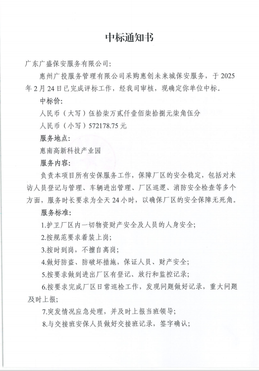 【中標(biāo)通知】采購惠創(chuàng)未來城保安服務(wù)
