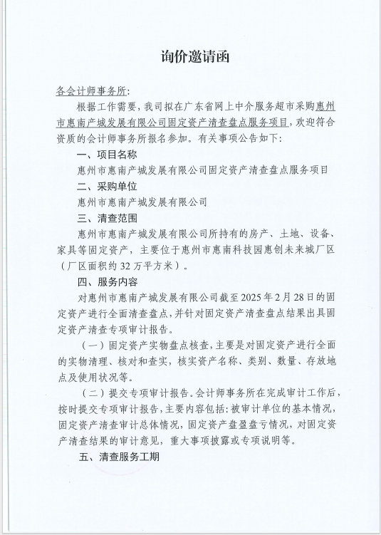 【招標(biāo)公告】惠州市惠南產(chǎn)城發(fā)展有限公司固定資產(chǎn)清查盤點服務(wù)項目