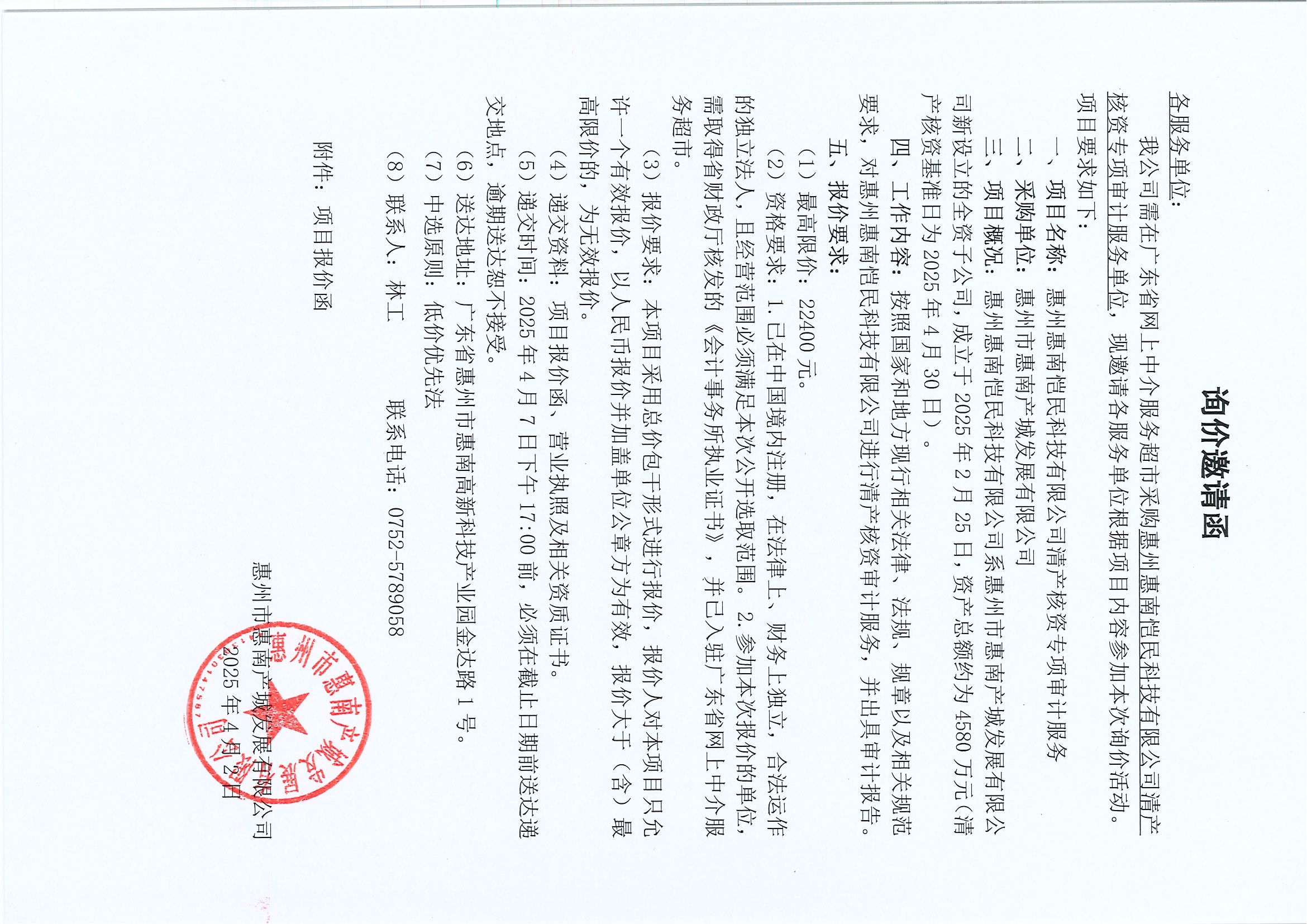 【詢價邀請函】惠州惠南愷民科技有限公司清產(chǎn)核資專項審計服務