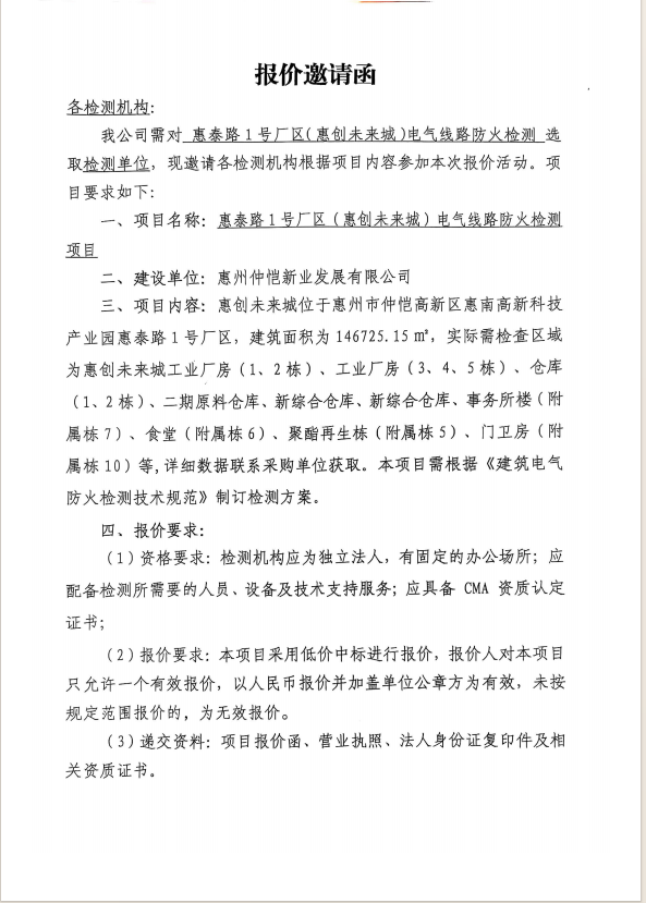 【報(bào)價(jià)邀請(qǐng)函】惠泰路1號(hào)廠區(qū)(惠創(chuàng)未來(lái)城)電氣線路防火檢測(cè)