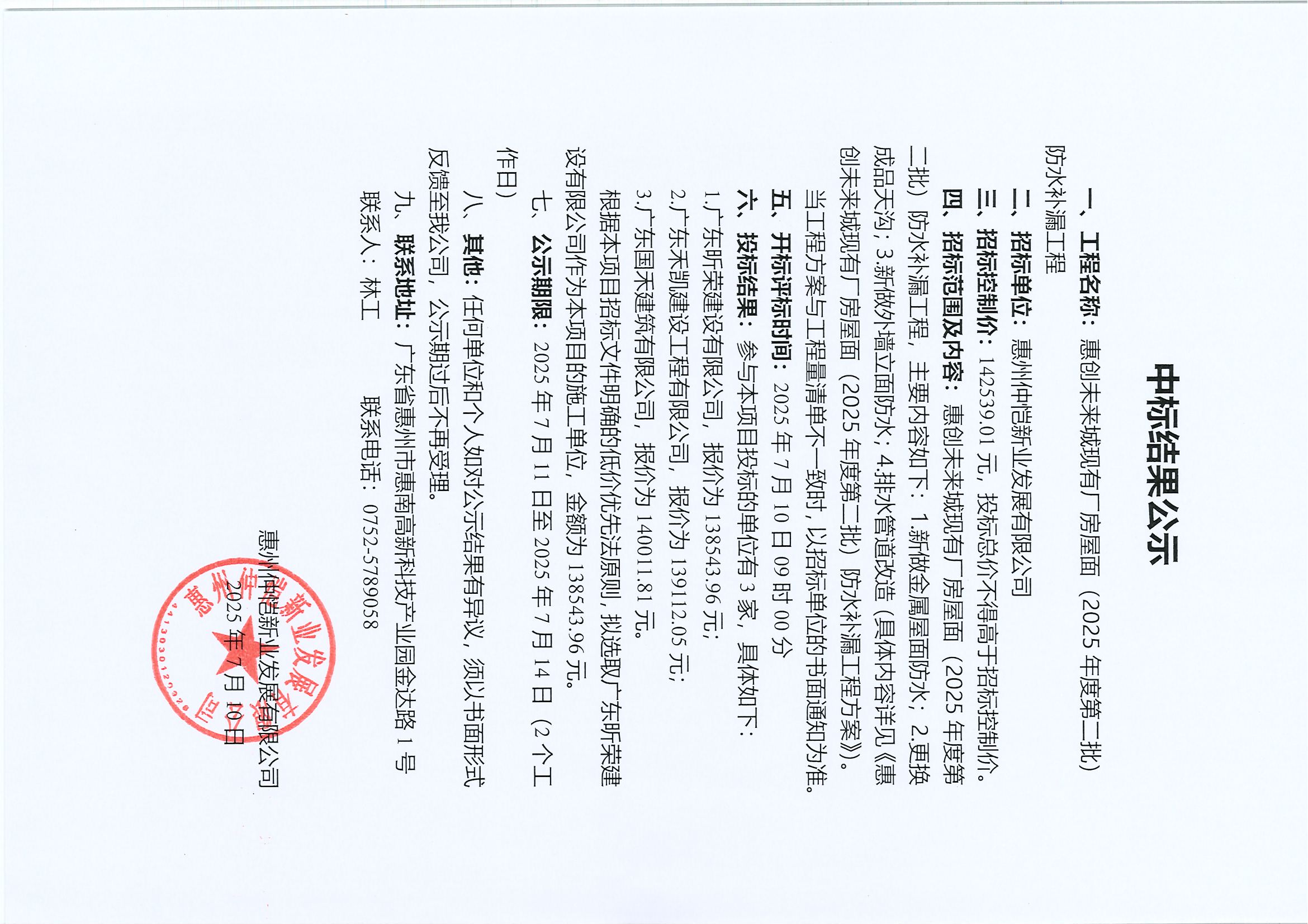 【中標結果公示】惠創(chuàng)未來城現有廠房屋面(2025年度第二批)防水補漏工程