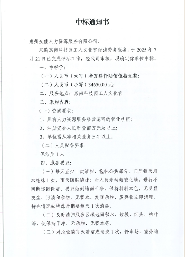 【中標通知】惠南科技園工人文化宮保潔服務(wù)