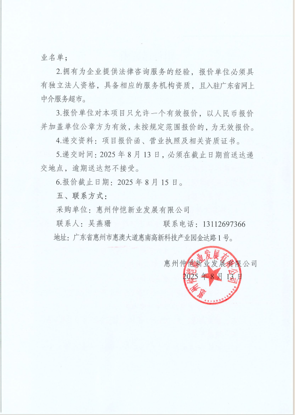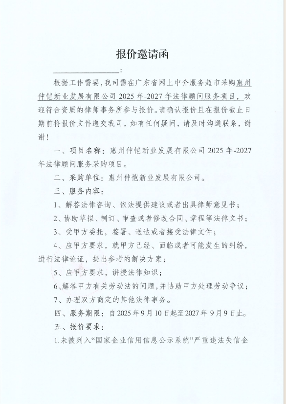 【報價邀請函】惠州仲愷新業(yè)發(fā)展有限公司2025年-2027年法律顧問服務采購項目
