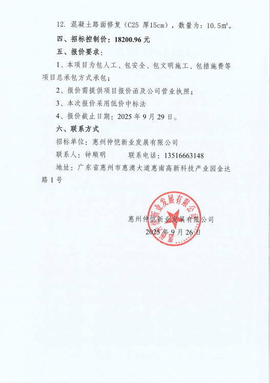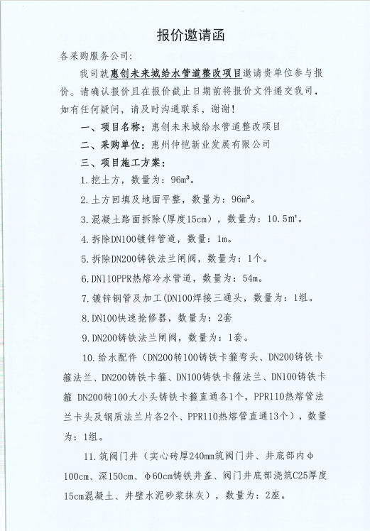 【詢價邀請函】惠創(chuàng)未來城給水管道整改項目