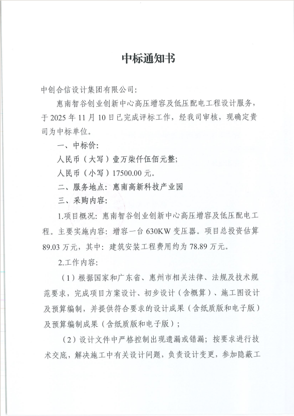 【中標(biāo)通知】惠南智谷創(chuàng)業(yè)創(chuàng)新中心高壓增容及低壓配電工程設(shè)計(jì)服務(wù)