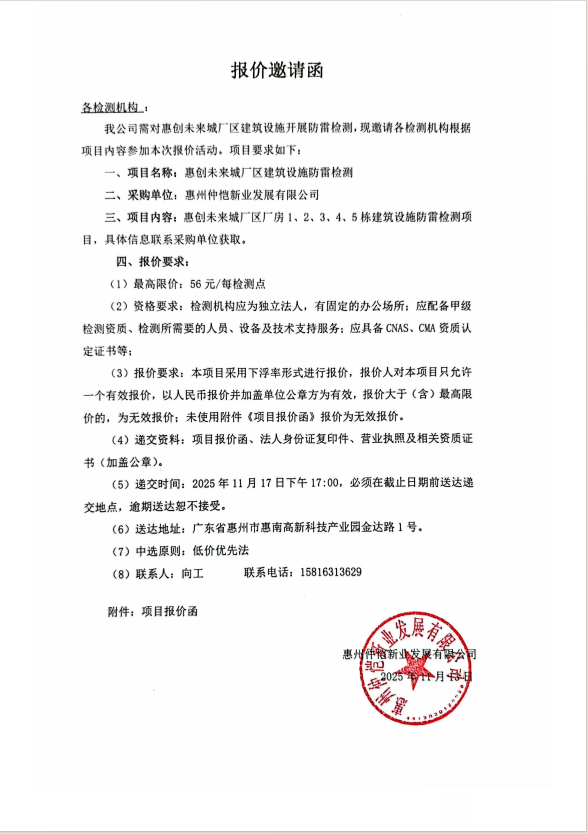 【報(bào)價(jià)邀請函】惠創(chuàng)未來城廠區(qū)廠房1、2、3、4、5棟建筑設(shè)施防雷檢測項(xiàng)目
