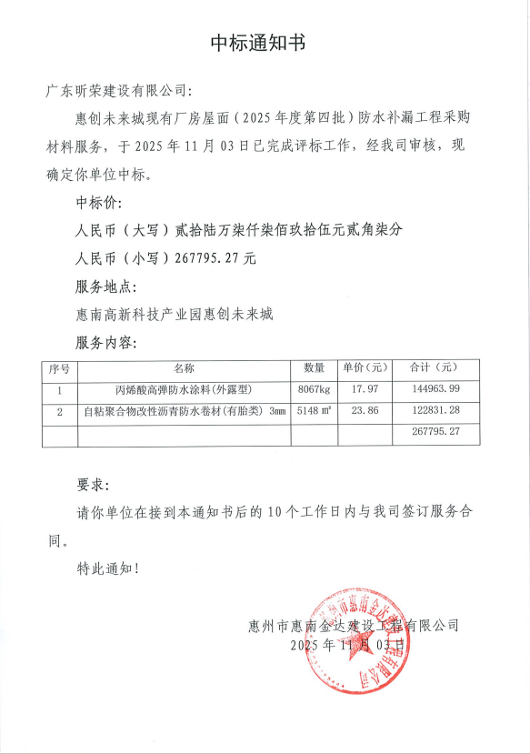 【中標通知】惠創(chuàng)未來城現(xiàn)有廠房屋面(2025年度第四批)防水補漏工程采購材料服務