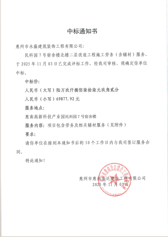 【中標通知】民科園7號宿舍樓北樓二層改造工程施工勞務(含輔材)服務