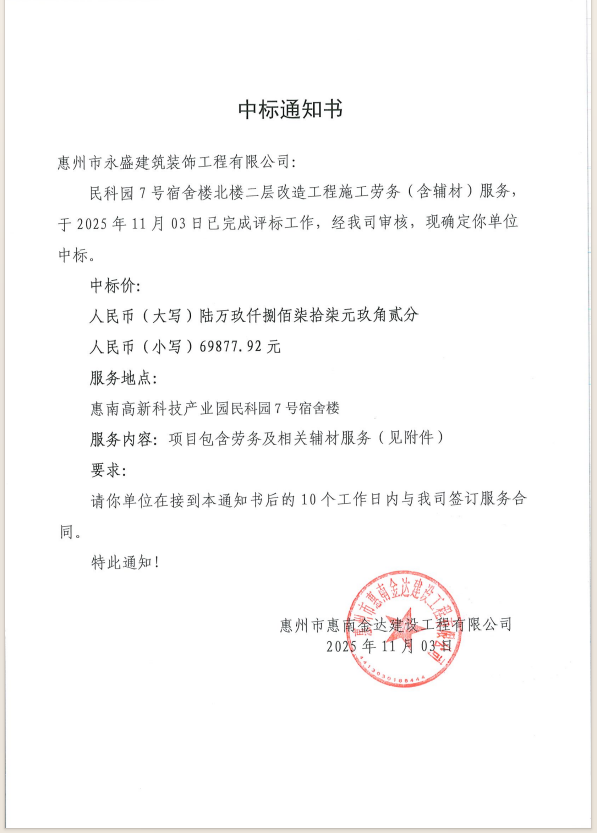 【中標(biāo)通知】民科園7號(hào)宿舍樓北樓三至五層改造工程施工勞務(wù)(含輔材)服務(wù)