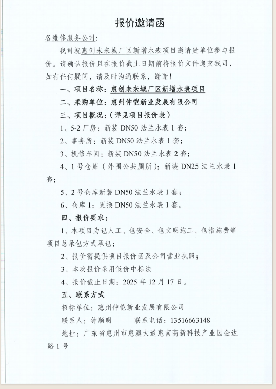【報價邀請函】惠創(chuàng)未來城廠區(qū)新增水表項目