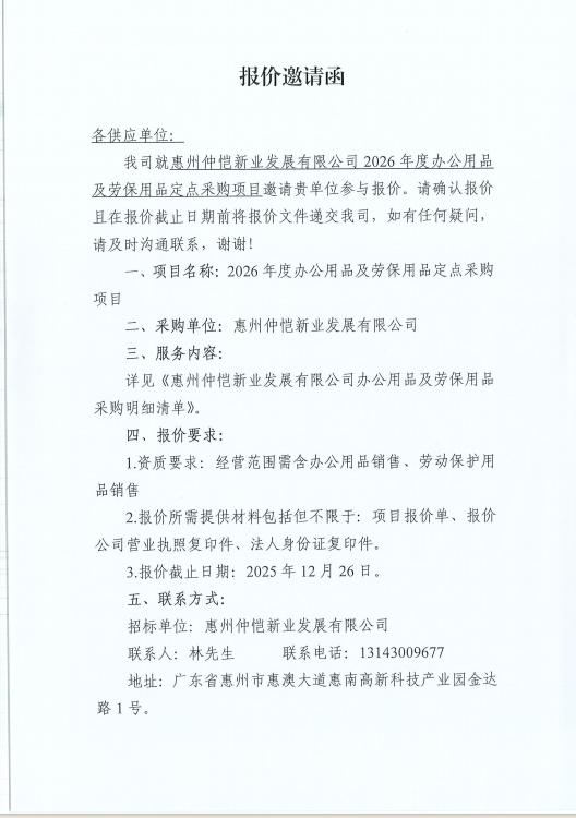 【報(bào)價(jià)邀請(qǐng)函】惠州仲愷新業(yè)發(fā)展有限公司2026年度辦公用品及勞保用品定點(diǎn)采購(gòu)項(xiàng)目