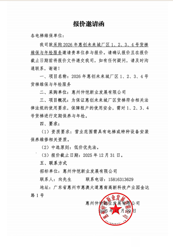 【報價邀請函】采購2026年惠創(chuàng)未來城廠區(qū)1、2、3、4號貨梯維保與年檢服務