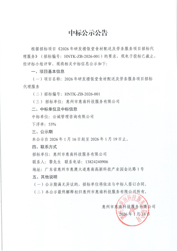 【中標(biāo)公示】2026年研發(fā)樓飯?zhí)檬巢呐渌图皠趧?wù)服務(wù)項目招標(biāo)代理服務(wù)