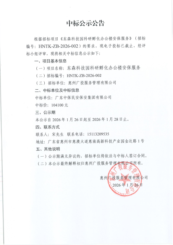 【中標公示】東森科技園科研孵化辦公樓安保服務(wù)