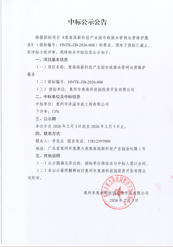 【中標(biāo)公示】惠南高新科技產(chǎn)業(yè)園市政排水管網(wǎng)運(yùn)營維護(hù)服務(wù)